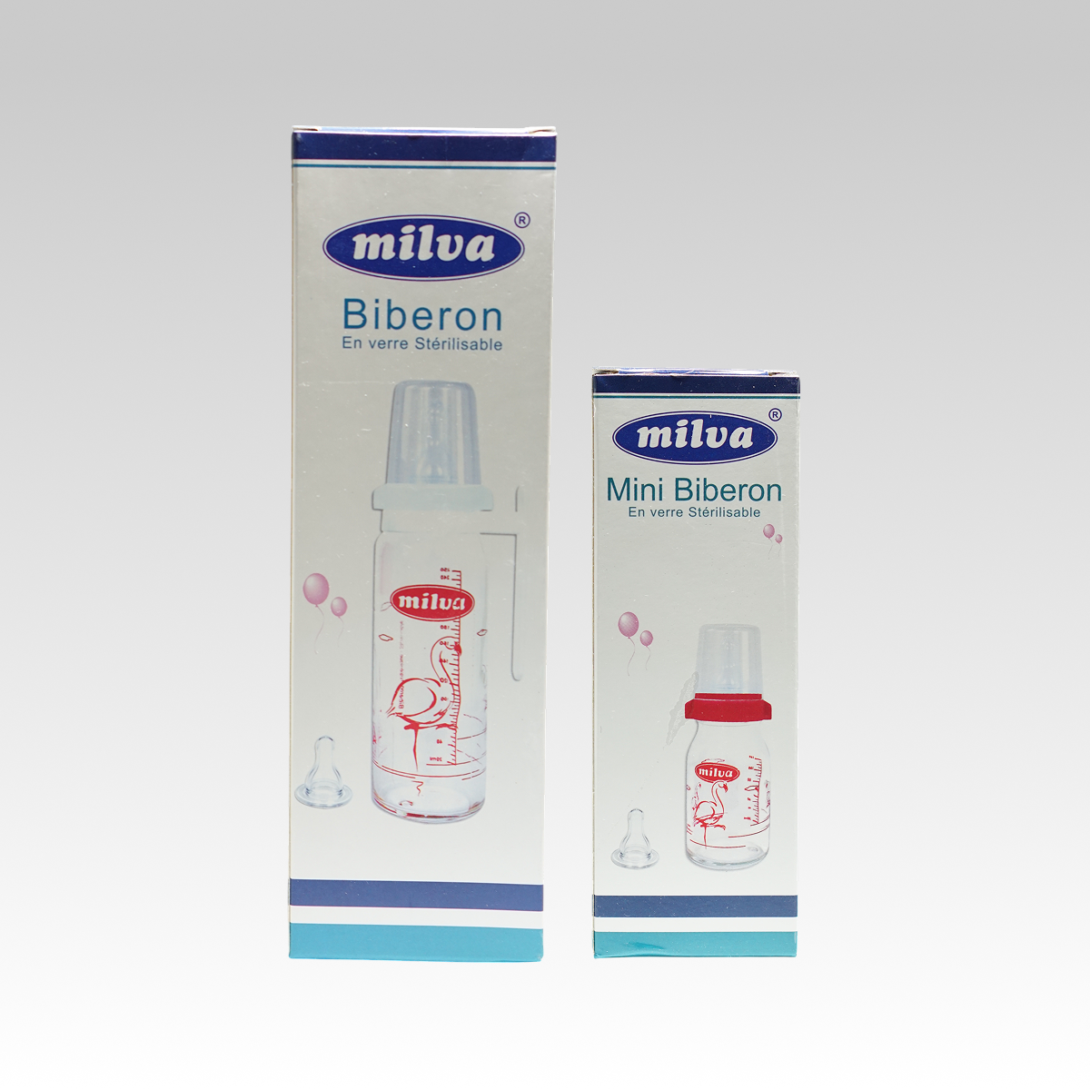 Durables et résistants, les biberons MILVA en verre borosilicate ne s’altèrent pas avec le temps, sont faciles à stériliser, résistants aux chocs thermiques, sains et inodores, idéales pour les nouveaux nés grâce aux tétines CLASSIC et ORTHO en gomme de silicone souples et non toxiques. Disponibles en deux capacités: 125 ml et 250 ml.