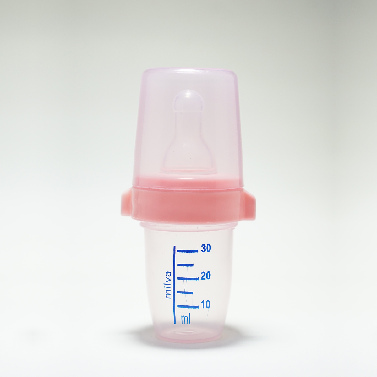 Composé d’un petit biberon 30 ml gradué en polypropylène avec une tétine en silicone.
